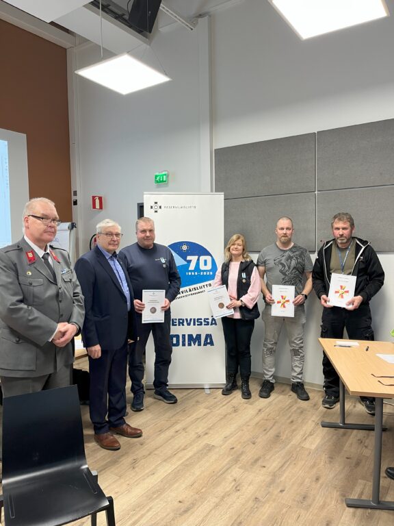 TikRes palkitsi 2025 kevätkokouksessa ansioituneita. Esa Rossi reserviläisliiton hopeinen ansiomitalli, Katja Porrassalmi reserviläisliiton pronssinen ansiomitalli, Ari Sylander TikRes vuoden reserviläinen, Kim Bågman TikRes vuoden ampuja