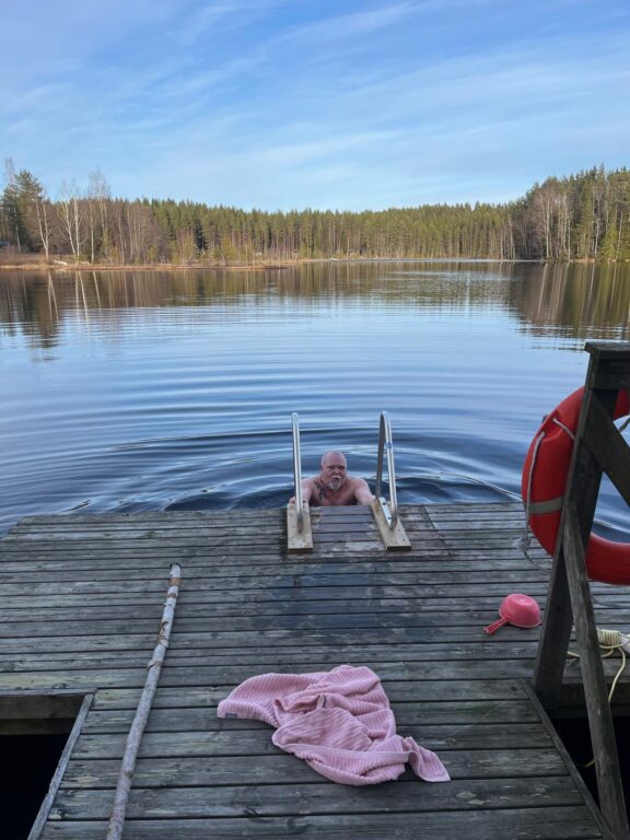 Jäseniä saapui paikalle kymmenkunta. Illan aikana juttelimme mm. Tulta toukokuussa-ampumatapahtuman järjestelyistä, Ukrainan avustusretkien kokemuksista sekä kuulimme vanhemman valtiomiehen, Esko Malkamäen, muisteloita. Saunassa muutamat rehvastelivat heittävänsä talviturkin ja olihan sitä sitten vastattava puheistaan. Vesi oli yllättävän lämmintä vaikka juuri jäät olivat lähteneet.